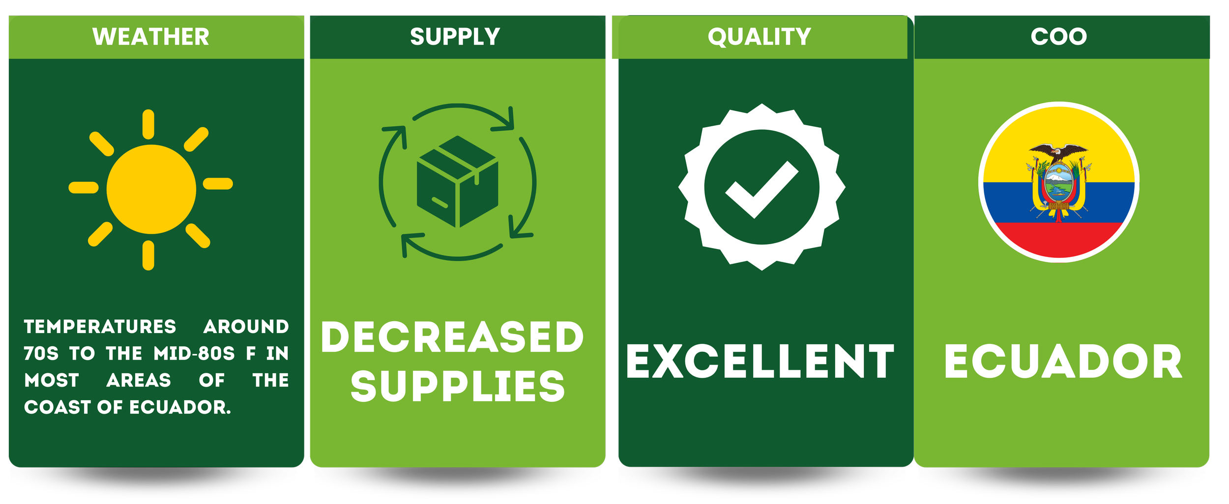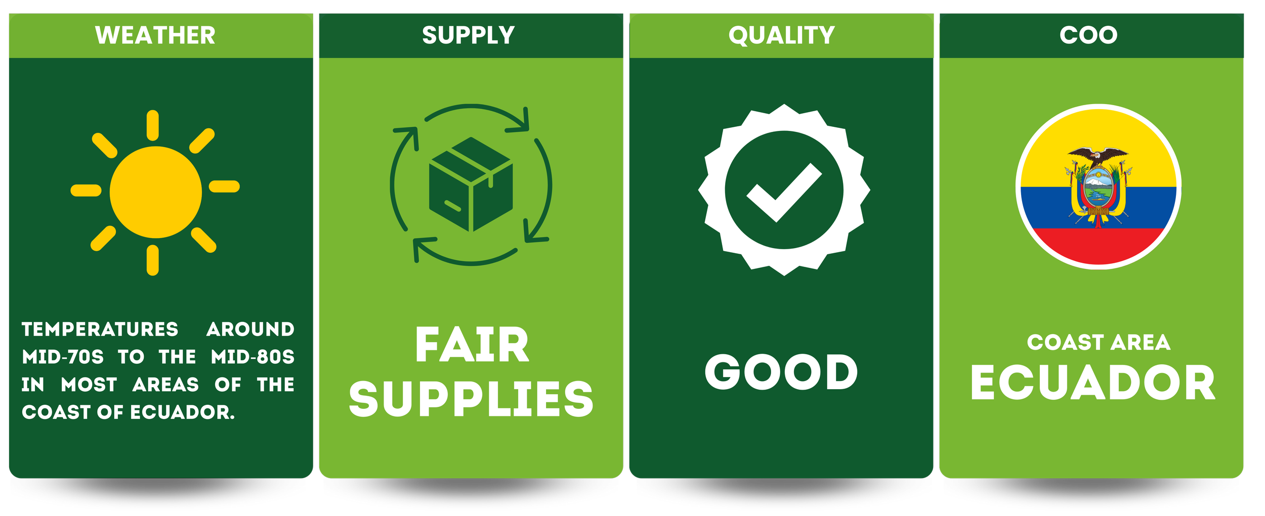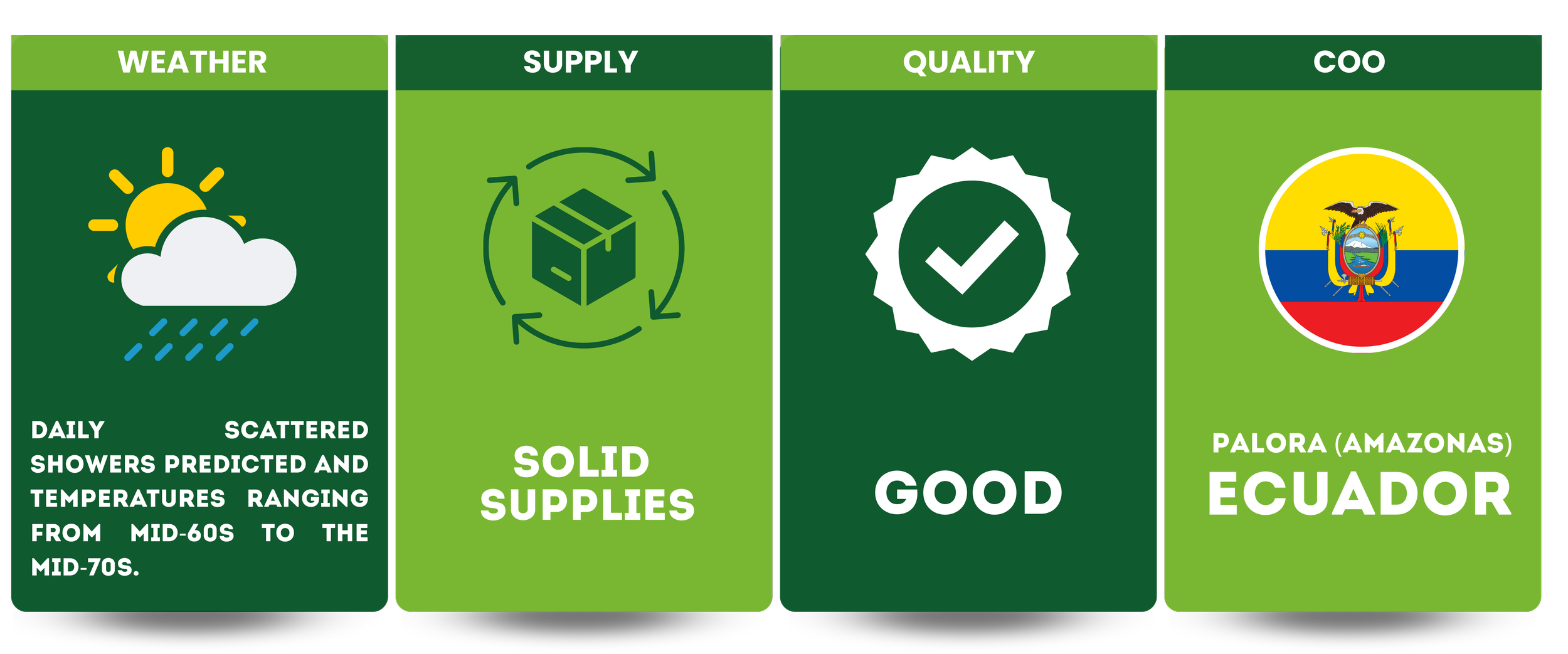 Existing week: Solid supply levels are expected for Week 7, with overall quality continuing to perform at an excellent level. Weather conditions in Ecuador’s Amazon region include scattered showers, with temperatures ranging from the low 60s to the low 70s.
