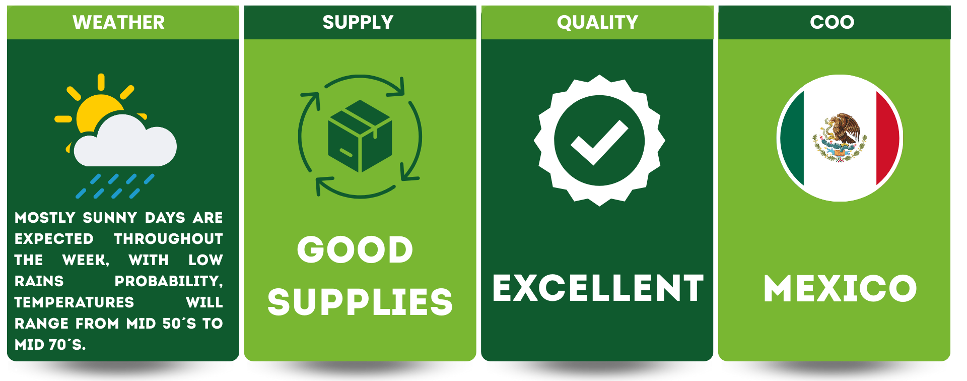 Existing week: Good supplies with excellent quality. Favorable weather in growing regions in Michoacan, Mexico ranging from mid-50´s to mid-70´s with low rains probability throughout Week 6.