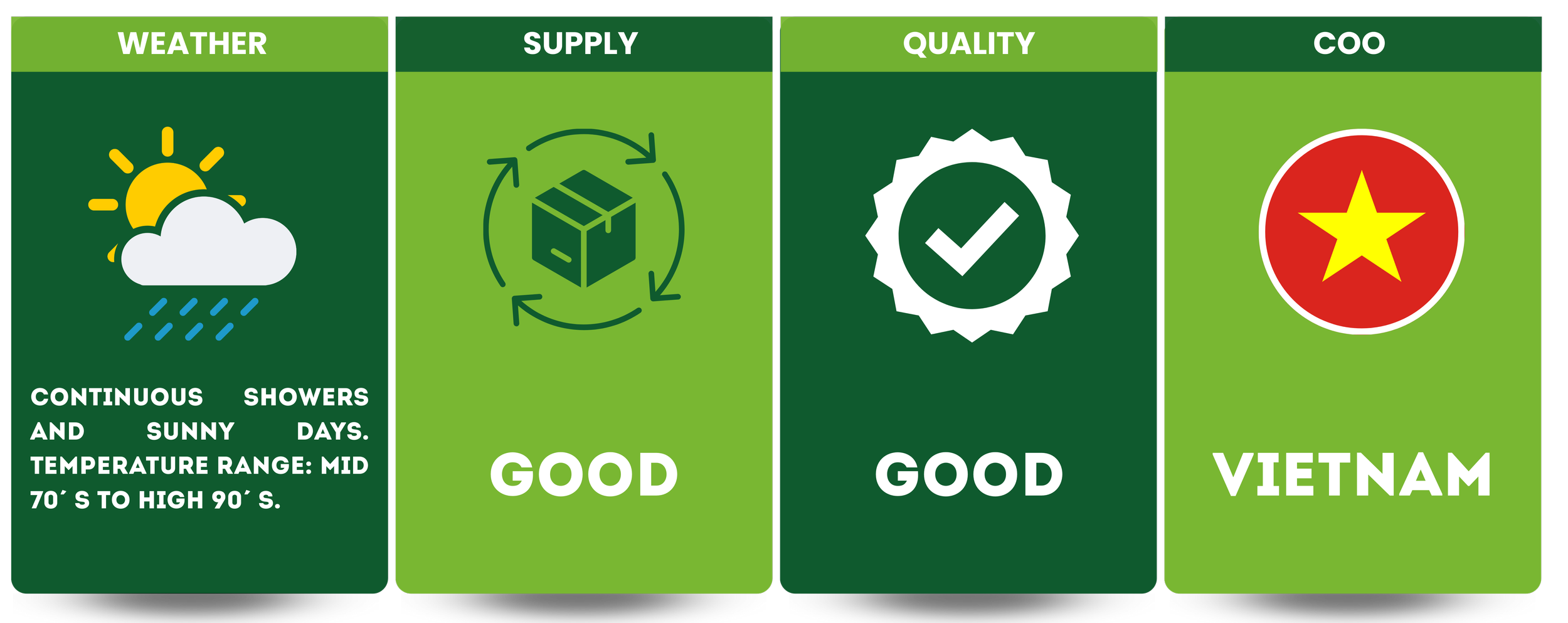 Existing week: Good supply levels and strong quality are expected for Week 7. Reduced rainfall across the Mekong Delta region is expected to support improved quality.